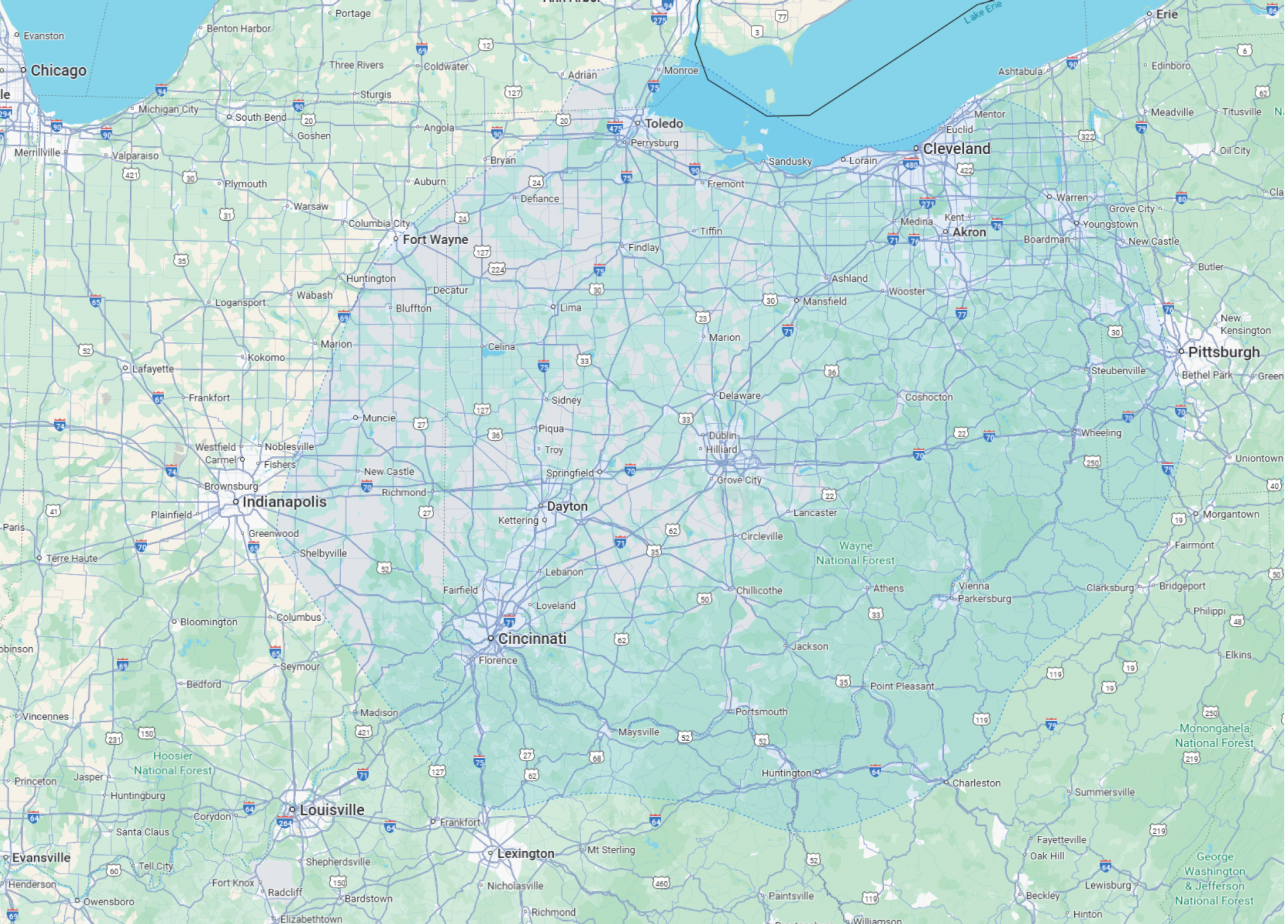 The above areas are within 3 hours from Columbus Ohio which is our standard inspection area. We will expand to 6 hours away if needed on a case by case basis.