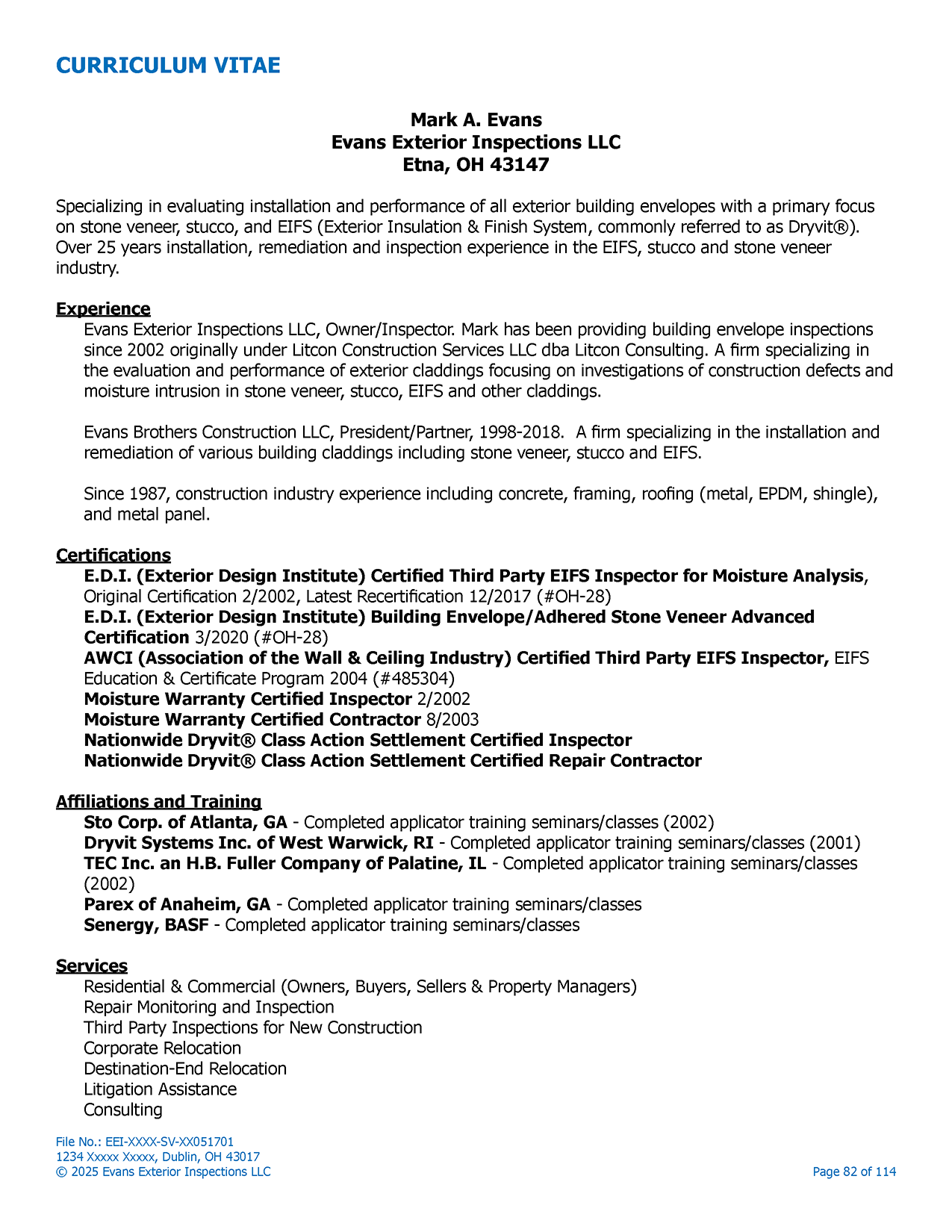 The majority of inspections completed are stucco and stone veneer along with remediation inspections verifying if the repiars were done correctly.